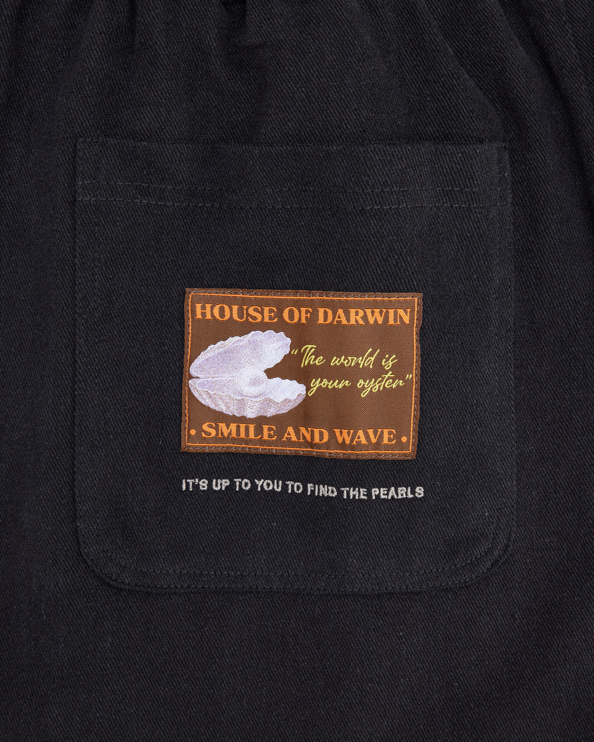 • Woven label sewn onto back pocket with embroidery underneath.